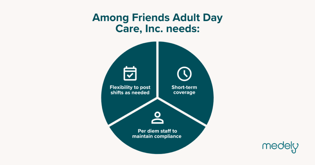 We sat down with Mike Rhodes, vice president of operations and compliance at Among Friends Adult Day Care Inc., to talk about his experience using Medely. Mike uses Medely on an as-needed basis to keep his facility compliant with state staffing regulations and able to quickly address any shortages or lack of appropriate coverage.